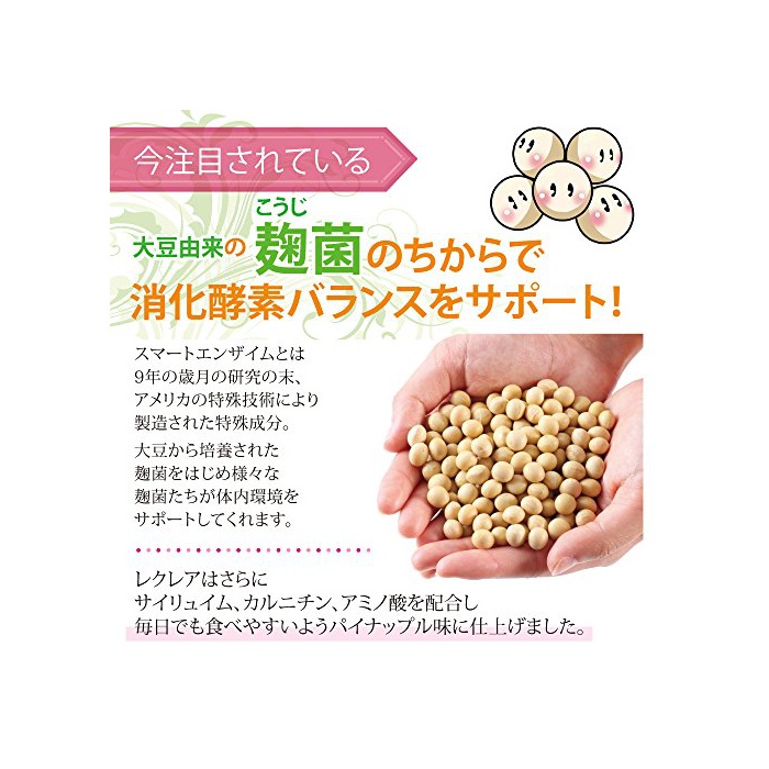 대두 유래 국균후에서에 소화 효소 밸런스를 서포트!해의 세월의 연구 끝에,미국의 특수 기술에 의해 제조 된 특수 성분 스마트《엔자이무》배합.한층 더 코뿔소 류 이《무》,카르니틴,아미노산을 배합하여 매일이라도 먹기 쉬운 바와 같이(하도록) 파인애플 맛으로 마무리했습니다.대두부터 배양 된국균을 비롯해 여러가지 국균들이 체내 환경을 서포트 해 줍니다.