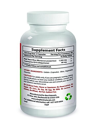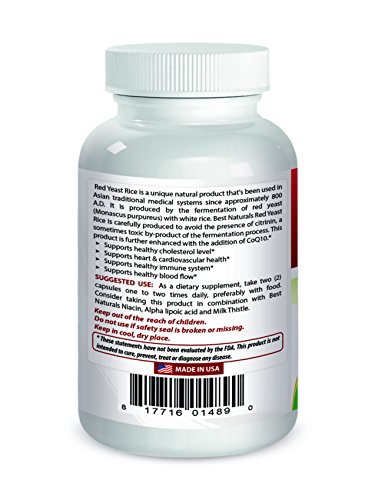 -. Feature : Best Naturals Red Yeast Rice with Coq10 combination is supporting healthy cholesterol level & cardiovascular function / Our Red Yeast Rice with coq10 also Supports Improved Immune Health, and Digestive Health / Our Red Yeast Rice with Coq10 contains 600 mg of red yeast rice and 30 mg of coq10 per capsule / No Artificial Color, Flavor or Sweetener, No Preservatives, No Sugar, No Starch, No Corn, No Soy, No Egg, No Lactose, No Gluten, No Wheat, No Yeast, No Fish, No Sodium. / TOP QUALITY GMP CERTIFIED PRODUCTS - All Best Naturals products are manufactured in accordance with Good Manufacturing Practices (GMP), among the highest standards in the world -- Proudly Made in USA -- Purity & Potency Guaranteed