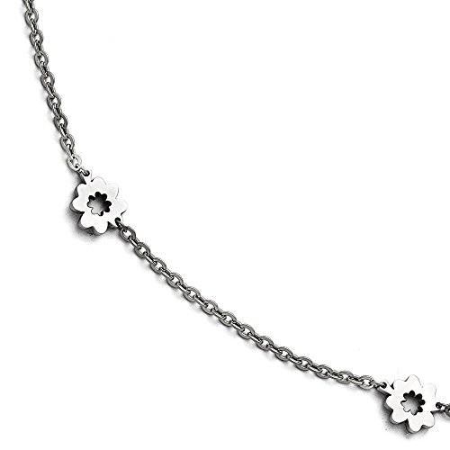 The beauty of this flower anklet is in the simplicity of the design and the bright metallic luster of the stainless steel construction. It features three 9mm (3/8 inch) flower charms stationed on 2mm width cable chain that closes with a spring ring clasp and is adjustable in length from 9 to 10 inches.Feature