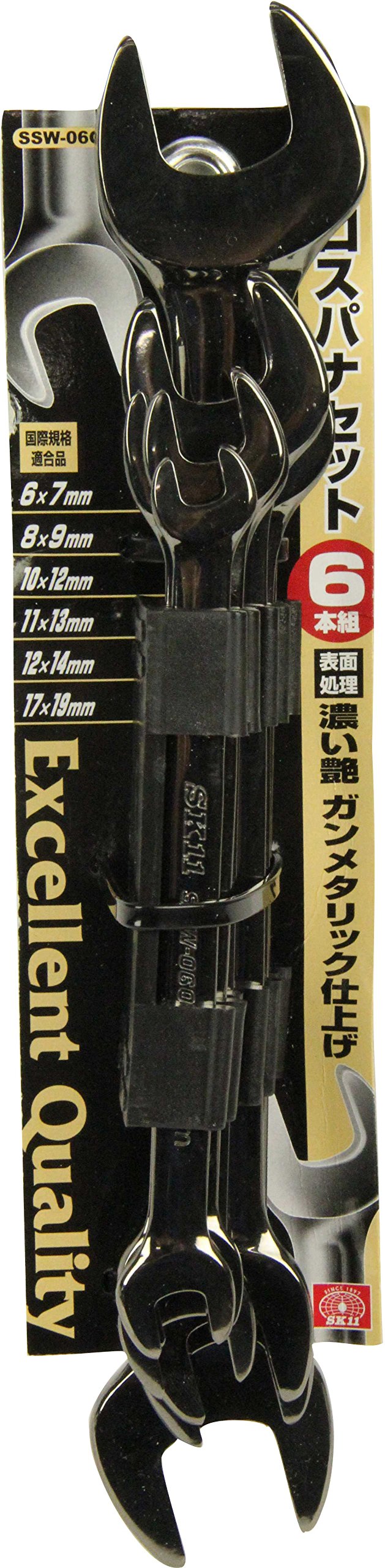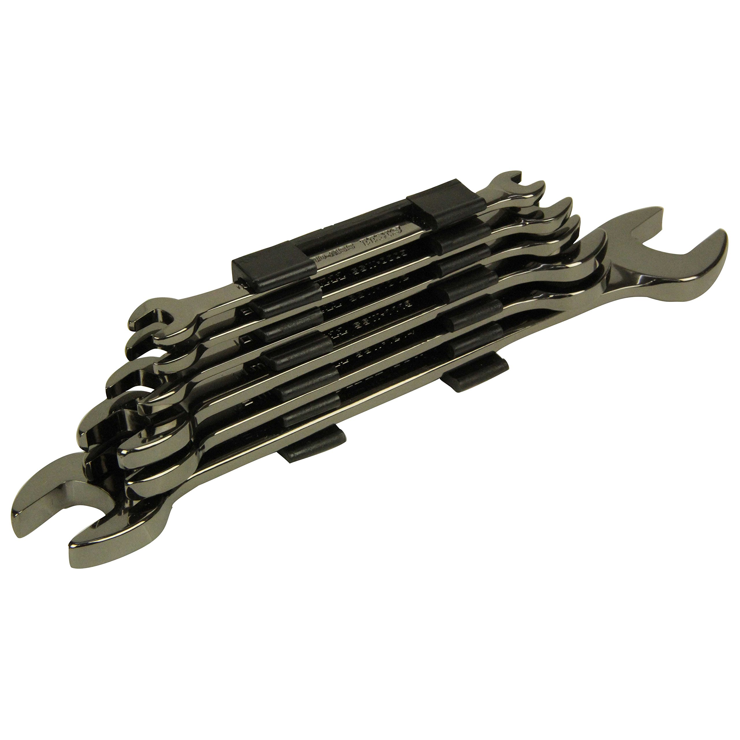 It is a dense glossy, gunmetallic finished double-ended spanner set.