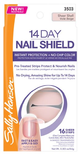 ReleaseDate : 2012-03-16 Studio : Coty Beauty Publisher : Coty Beauty Binding : Misc. Product Description Sally Hansen 14 day nail shields are real nail color strips that instantly protect and nourish nails for up to 14 days. Maximum protection plus no chip color. Color infused strips bond to nails to give an instant manicure with maximized protection and strength. No dry time, smudging or chipping. The pearl protein and natural botanical formula nourishes nails up to 14 days. Odor-free application. 0