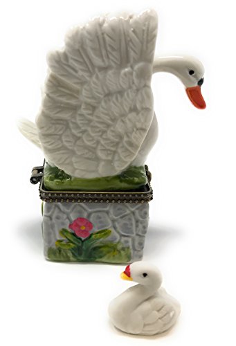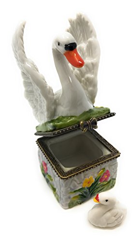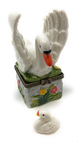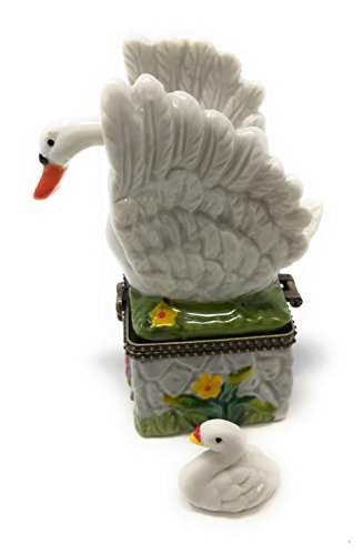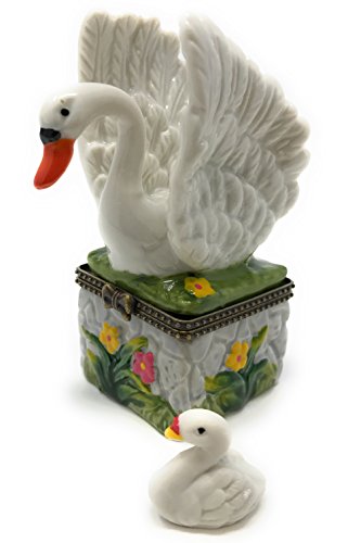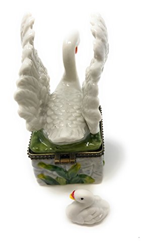 Swan on Porcelain Hinged Lid Trinket Box with Tiny Swan Trinket Inside, By Artgifts, 3.25"T