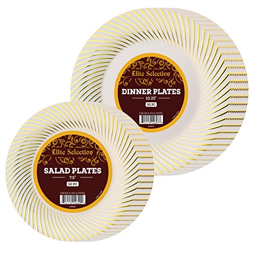 Elite Selection Combo Set Of 100 Plastic Plates Gold Swirl Rim Includes 50 Dinner Plates 10.25" And 50 Salad / Dessert Plates 7.5"