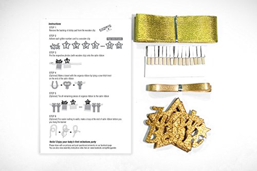 -. Feature : Stunning: Shimmering gold glitter finish premium grade cardstock with cutout of "Just Born" and numbers 1 to 12. / Great Gift: Handmade and beautifully packed. Can also be used as a thoughtful baby shower gift. / Big Bundle: Packed with 8 feet luxurious satin ribbon in bronze gold with plenty of excess for all landscape/portrait 4x6 4R photos, 4 strands of 21" organza ribbon as additional ornaments, and natural wooden clothespins. / Decorative: With long-lasting glittered high quality durable cardstock, you can savor the precious memories by using them for display during and after a birthday party. / Easy DIY: Props are cut out in shapes. ASSEMBLY IS REQUIRED. Package includes ribbons, clothespin/pegs with adhesive pad.