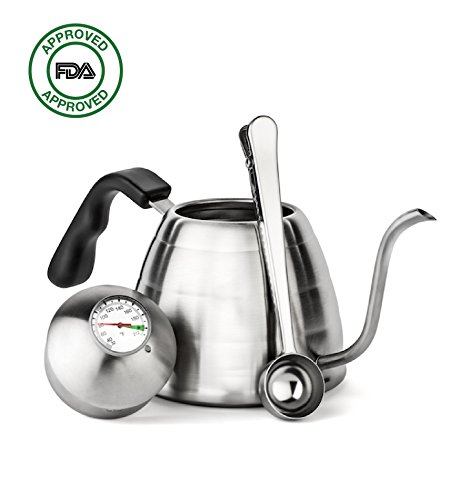 COFFEE LOVERS DESIRE THE BEST CUP OF JOE AT A REASONABLE PRICE.?Gracefully Yaya's Stainless Steel Coffee Kettle Provides The Perfect Cup Of Delicious Coffee Guaranteed To Impress Every Coffee Snob. OUR POUR OVER TEA KETTLE HELPS YOU CONTROL 4 OF THE 7 PILLARS FOR COFFEE BREWING PERFECTION The Brewing Method Coffee To Water Ratio Water Contact Time Water Temperature. Coffee Enthusiasts Look For A Coffee Kettle That Offers The Best Design To Craft A Precise, Well Balanced, Flavorful And Robust Cup Of Coffee;?AS GOOD OR BETTER THAN THE CORNER COFFEE SHOP. Our Coffee Pour Over Kettle Gives You All That You Want, Need And Desire; A Cup Of Coffee With A Clean,?Fully Developed Flavor And Body. OUR INTEGRATED THERMOMETER GUARANTEES THAT YOU HAVE?THE PERFECT POURING TEMPERATURE OF 195 DEGREES, Not Too Hot, Not Too Cold, And No Scorched Flavor. Bigger Bloom Means More Flavor And Fresher Tasting Coffee.?Our Ergonomic Handle Combined With The THE GOOSENECK SPOUT ALLOWS FOR THE PERFECT POUR OVER METHOD, Slow, Smooth And Controlled To Help You Achieve That Desirable "Coffee Bloom".? Our Pour Over Teakettle Is Designed For Function And Long Lasting Durability With A Stylish Look. CONSTRUCTED WITH THE FINEST FDA APPROVED CORROSION RESISTANT STAINLESS STEEL And Safe For Use With Gas, Electric Or Induction Stoves. Coffee Is Personal! The Right Way To Make Coffee Is How YOU Like It Best. BE GUARANTEED OF A SATISFYING CUP EVERY TIME YOU USE OUR POUR OVER DRIP METHOD. Enjoy This Relaxing Method That Makes You Instrumental In The Brew Process, Rewarding You With A Wonderfully Satisfying Cup Of Your Favorite Grind...Make This Yours...Make It Personal. BUILT FOR TRAVEL, TAKE CAMPING, USE OUTDOORS OR FILL YOUR THERMOS! 0 |