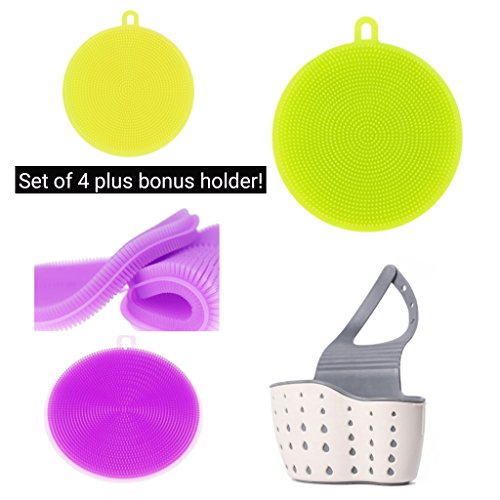 Antibacterial Double Sided Silicon Cleaning Brushes with Holder. Use For Kitchen Insulation Mats, Dish Brush, Makeup Brush Cleaner, Jar Opener, Clothes Brush, Shower Brush Fruits/Vegetables Brush