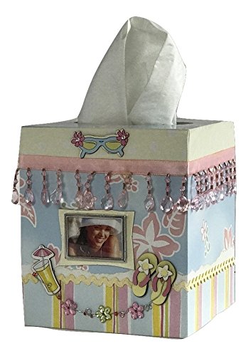 - STYLISH DESIGN Flips flops, beach umbrellas, sunglasses and starfish adorn this stylish and whimsical tissue box holder. The perfect addition for a beach house bathroom or bedroom. Or use it at home to remind you of summer days at the beach! Tissue box has a 1.25” x 1.75” photo frame mounted on front.