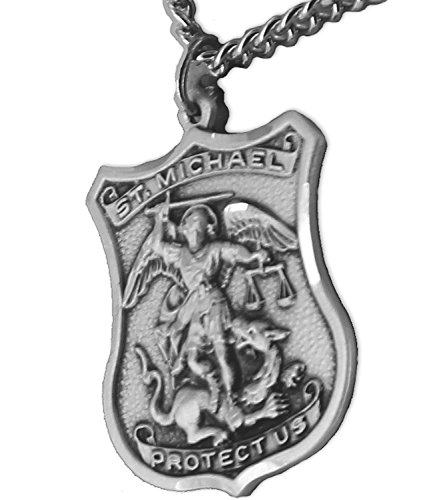 -. Feature : Sterling silver 1-1/4 inch shield shape engraved St. Michael medal, Patron of Police on 24 inch silver chain. / Medal size: 1-1/4 inch length / Chain size: 24 inch length stainless steel rhodium finish chain with a lobster claw clasp for a secure closure. / The rhodium finish protects the chain from tarnishing. / Jewelry Box Shown with Sample Medal.