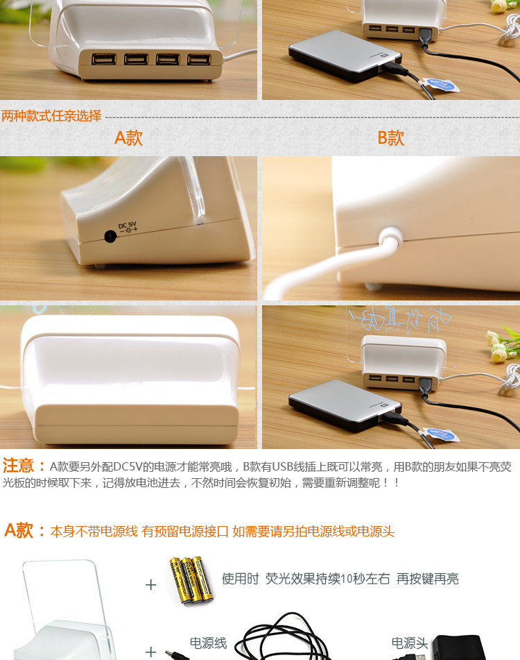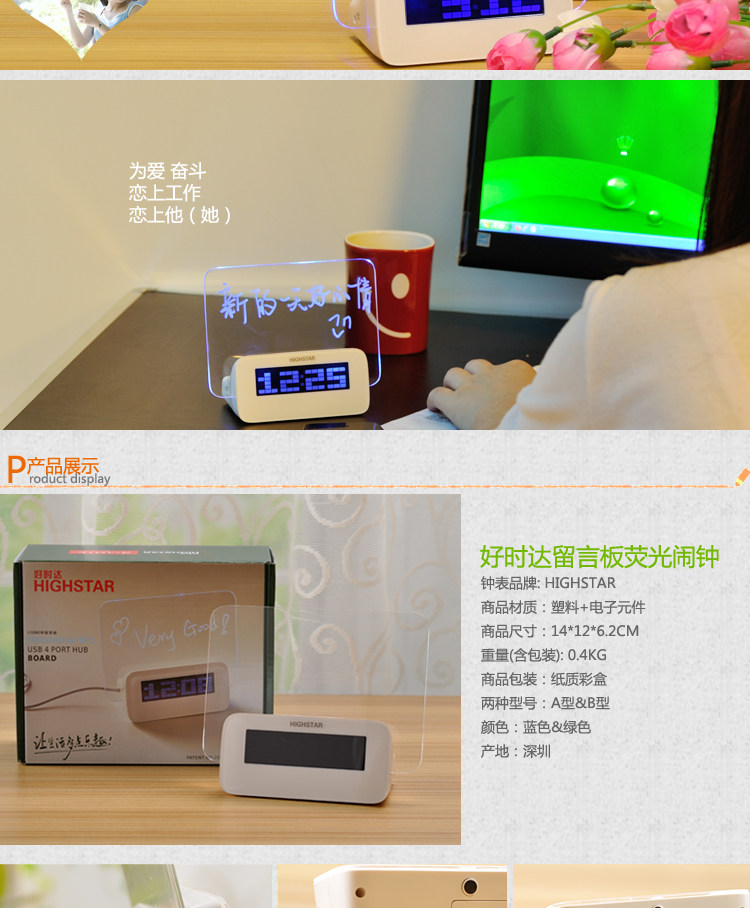 Tip: When using an external power supply・ clock and message board is a long bright background light; If the battery when the product will have a backlight operation・ if there is no operation for 10 seconds・ then automatically turn off.
