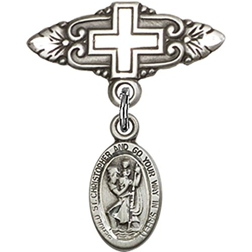 -. Title : Sterling Silver Baby Badge with St. Christopher Charm and Badge Pin with Cross 7/8 X 3/4 inches