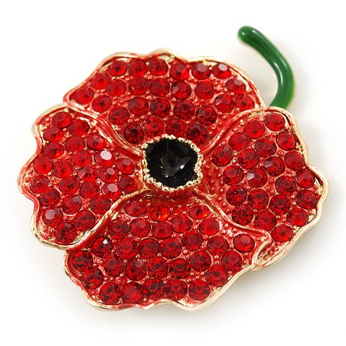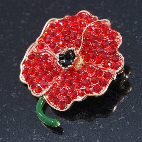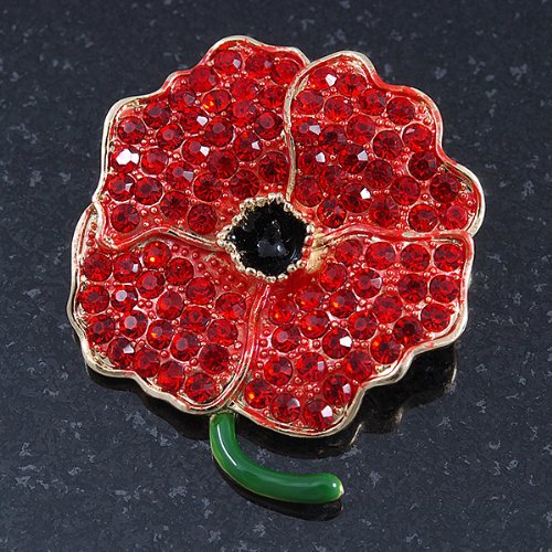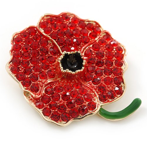 -. Title : Red Austrian Crystal Poppy Flower Brooch In Gold Plating - 40mm Length