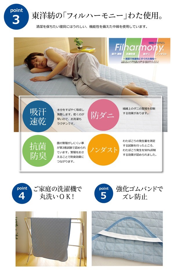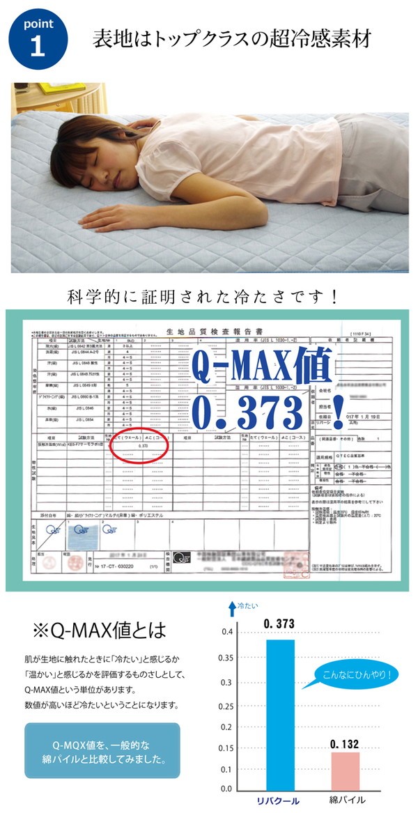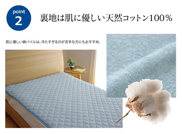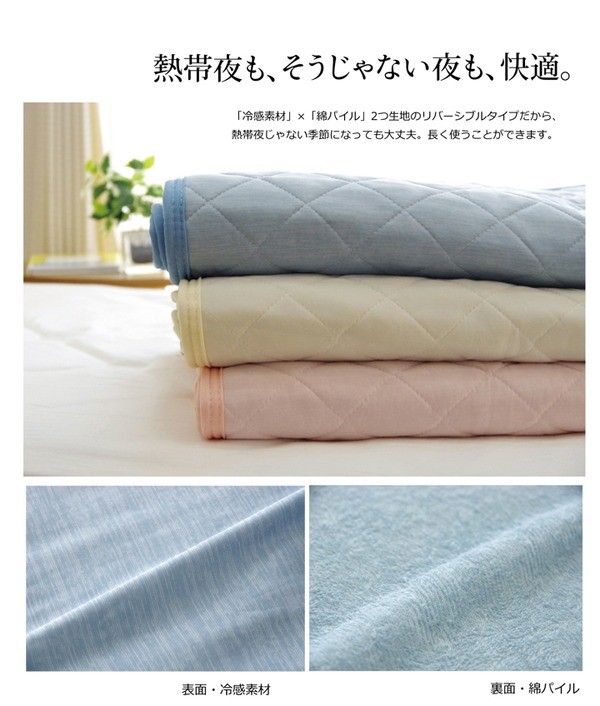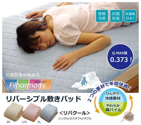 表生地にナイロン素材を使用、裏地に綿素材を使用した、リバーシブルタイプの敷きパッドです。表地にはナイロンにメーカーの技術で冷感を高める工夫をした生地を使用しています。肌が生地に触れたときに「冷たい」と感じるか「あたたかい」と感じるかを評価するものさしとしてQ-MAX値という単位があります(数値が高いほど冷たい)。本商品はQ-MAX値0.373です。中わたには東洋紡の機能綿「フィルハーモニィ」を使用。フィルハーモニィの特長として1.吸汗・速乾性 2.抗菌・防臭性 3.防ダニ性 4.わたほこりの発生量が非常に少ない などがあります。エアコンが苦手な方でも快適に、節電、節約にもつながる商品です。裏地には綿100%タオル地の生地を使用しています。タオル地なので柔らかく、吸水性にも優れています。冷感素材とタオル地のリバーシブルなので季節を選ばず、オールシーズンご使用頂けます。ズレにくいよう四隅にはゴムバンド付きです。ご家庭の洗濯機で洗える(ネット使用)ので清潔にご使用頂けます。リバクールシリーズは他にキルトケット、枕パッドの取り扱いもあります。