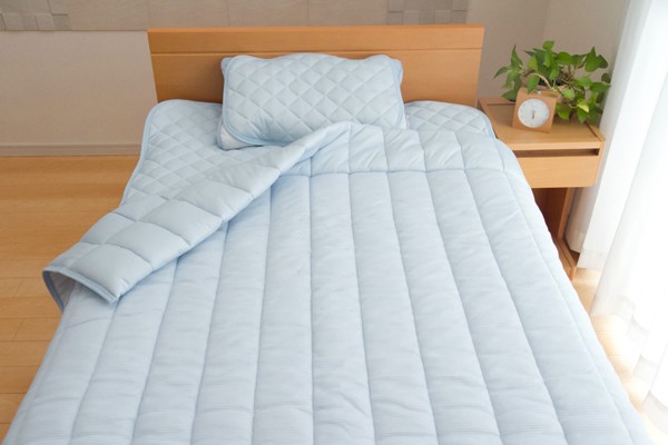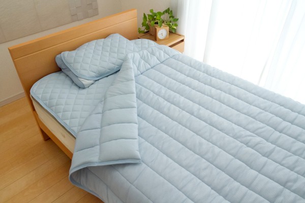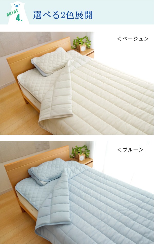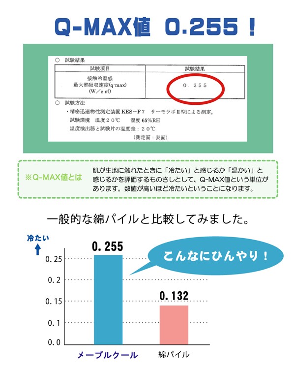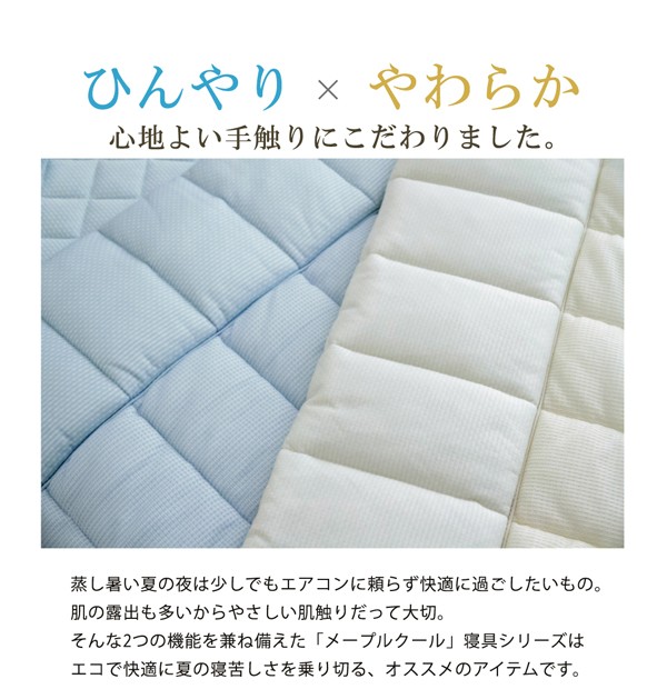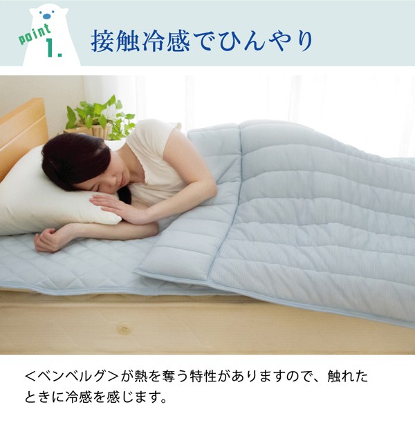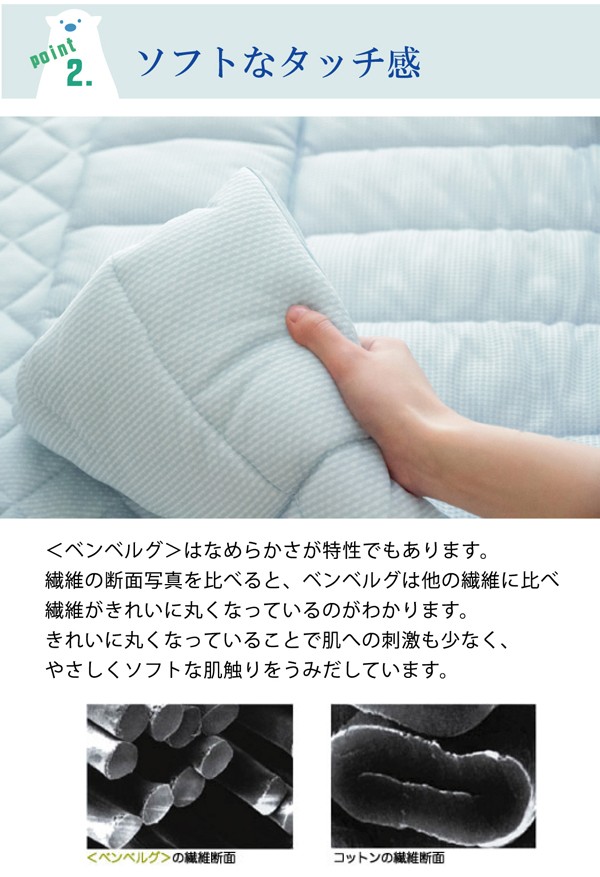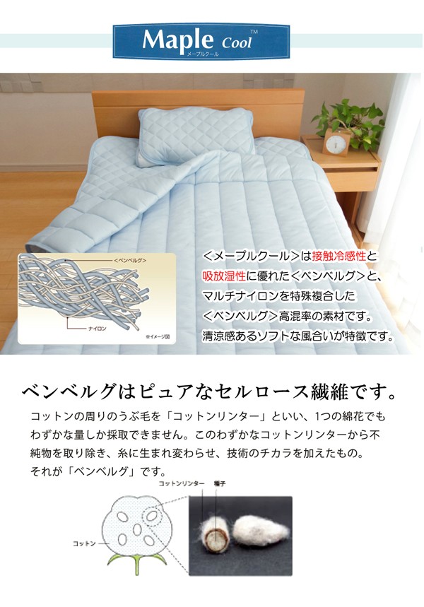 旭化成繊維『ベンベルグ』に冷たい繊維であるナイロンをプラスすることにより、より冷たくひんやりとした肌触りの商品です。肌に触れたときのなめらかな肌触りが特徴です。また水分を多く含み、水を通して肌から熱を奪うのためひんやりとしています。目に見えない極めて小さな水分の通り道から湿気をすばやく吸い取り、空気中へと吐き出すため、べたつきやムレを抑えてくれます。暑さで寝苦しい夜も快適に過ごすことが出来ます。洗濯機で丸洗いが可能なので、いつでも清潔にご使用頂けます。