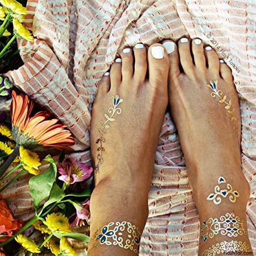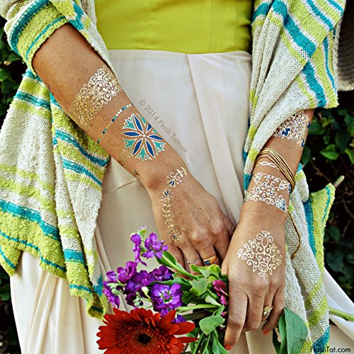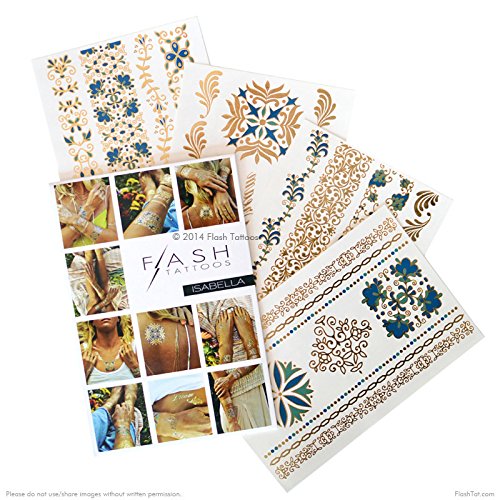 4 sheets- over 33 floral jewelry-inspired colorful tattoos in metallic gold, blue and green colors