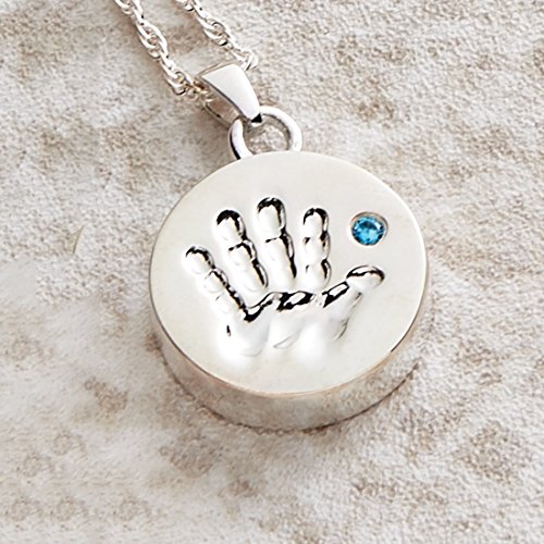 Funeral Cremation Jewelry - Urn Necklace - Sterling Silver Keepsake Pendant with Baby/Child Hand print and Blue Stone - For Ashes