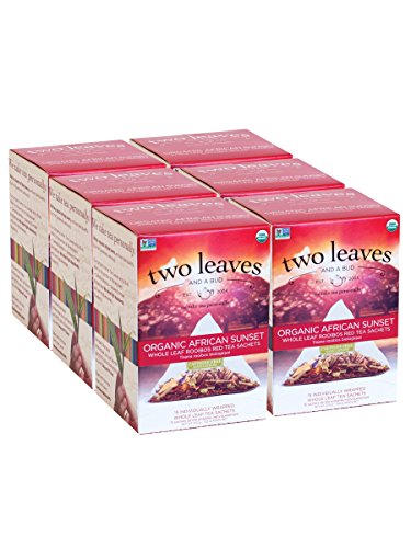 -. Binding : Grocery -. Brand : Two Leaves Tea Company -. EAN : 0894058000910 -. Feature : Whole Leaf Rooibos Red Tea Sachets / Origin: South Africa / Caffeine: No Buzz, Nada, Zip / Steep Time: 3 Minutes / Case of six 15-sachet boxes (total of 90 tea sachets) / Tangy, smooth, rich flavor with a sweet citrus finish / High in antioxidants / Completely caffeine-free / Hills grown in South Africa -. Label : Two Leaves Tea Company -. Manufacturer : Two Leaves Tea Company -. Model : T00915 -. MPN : T00915 -. NumberOfItems : 1 -. PackageQuantity : 6 -. PartNumber : T00915 -. ProductGroup : Grocery -. ProductTypeName : GROCERY -. Publisher : Two Leaves Tea Company -. ReleaseDate : 2006-04-19 -. Studio : Two Leaves Tea Company -. Title : Organic African Sunset Red Tea, 15 Count (Pack of 6) -. UPC : 894058000910