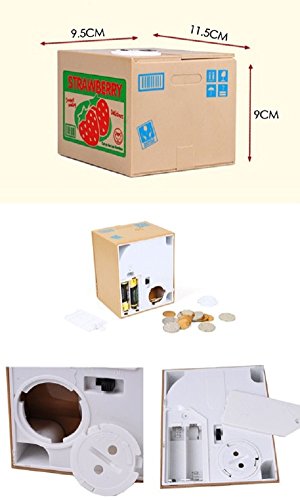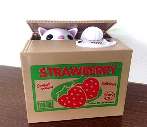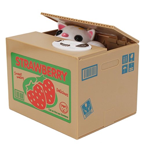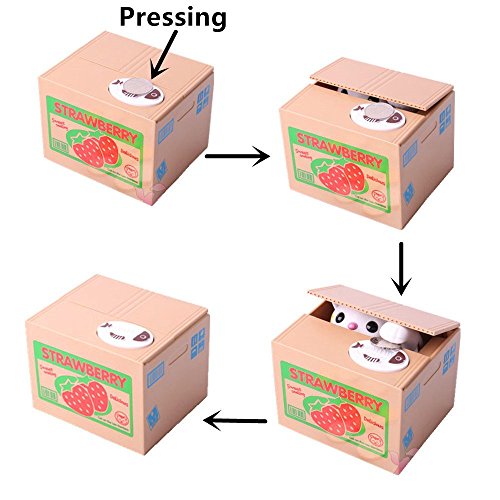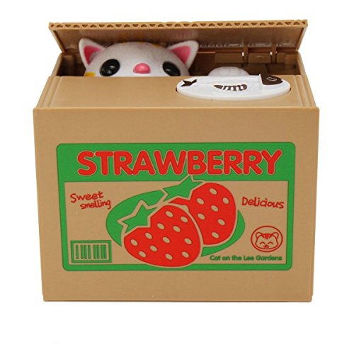 CUTE & ADORABLE - Place any size coin on top of the strawberry box and the adorable kitten will pop up, take the coin and then go back in the box. Cat says "hello," takes coin, and then says "thank you" - works on all American coins.