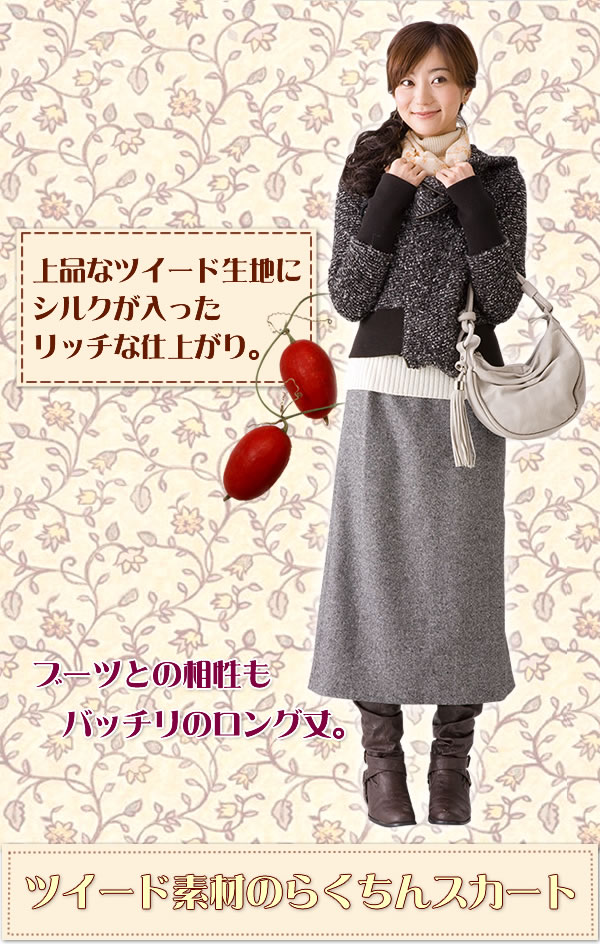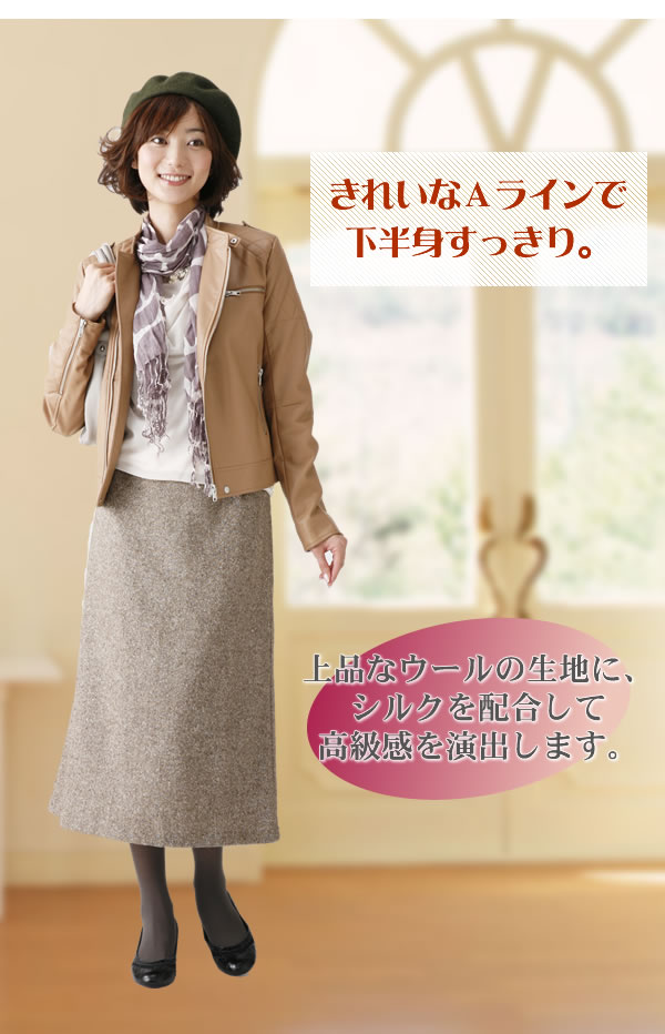 | あたたかいウールのツイード生地にシルクを加えた、上品なAラインスカート。ウエストゴムで楽にはけるのが嬉しい♪脚を冷やさず、ブーツにも合わせやすい丈です。 |