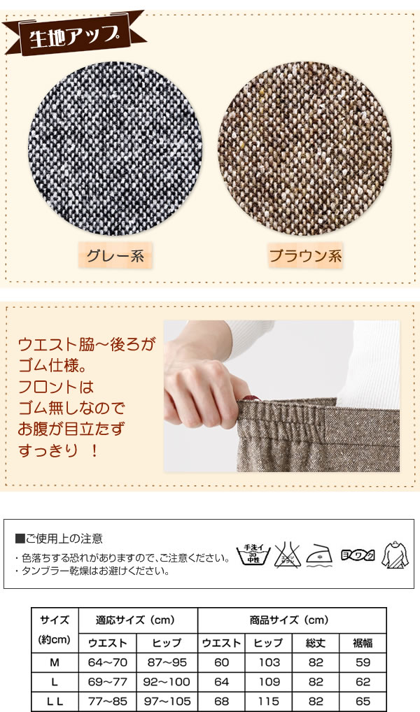 | <h1>あたたかいウールのツイード生地に、シルクを配合して高級感を演出。上品なのにウエストゴムで、楽にはけるのが嬉しいポイント♪自宅で手洗いもできます。</h1> |