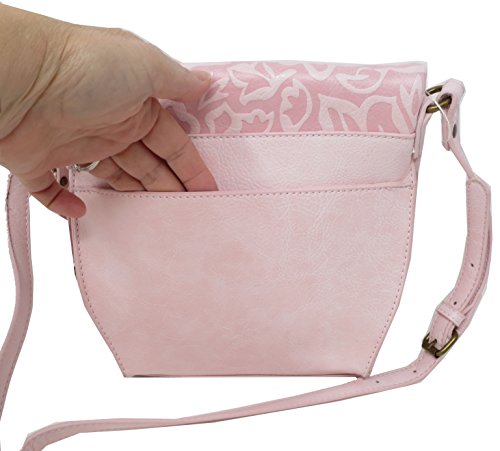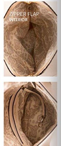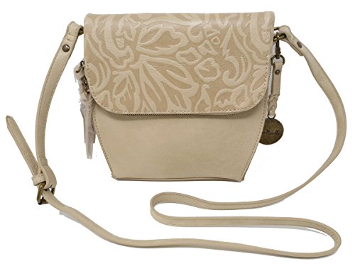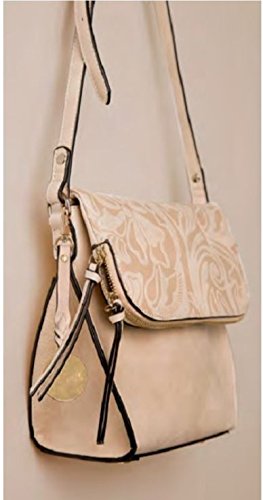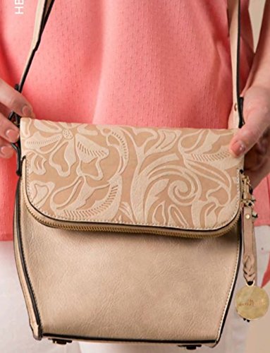 We love this crossbody messenger bag in vegan non leather. It features a fold over flap with zipper and features the Tobacco Road signature embossing. This fold over zipped pocket is deep and separate from the other compartment.