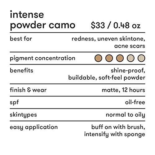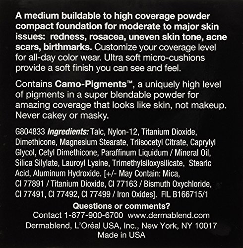 -. Binding : Health and Beauty -. Brand : Dermablend -. Feature : Medium to full coverage foundation / Shine proof finish / For sheer coverage apply with a brush / For maximum coverage apply with a sponge and build coverage -. Label : Dermablend -. Manufacturer : Dermablend -. PackageQuantity : 1 -. ProductGroup : Prestige Beauty -. ProductTypeName : LUXURY_BEAUTY -. Publisher : Dermablend -. Studio : Dermablend -. Title : Dermablend Intense Powder Medium To Full Coverage Foundation Makeup With Matte Finish, 15 Shades, 0.48 Oz.