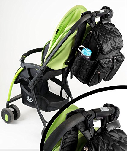 OUTSTANDING FEATURES; integrated stroller straps; external insulated cargo pockets; side bottle pockets; easy access cellphone pocket; elasticized interior storage pouches; INCLUDES easy clean diaper changing pad and diaper wet bag