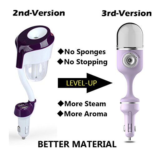 - >>1. NEW 3rd-Version LEVEL-UP: Based on buyer's feedback of 2nd-Version car diffuser, we designed this new version in this year 2018, improved quality and solved many problems. Now this new version car diffuser no need sponges filter to transport water/oil, so it will never blocked by oil and also you can change oil type easier, keep work longer time. (Pls keep enough water into the water tank and put it vertically.)