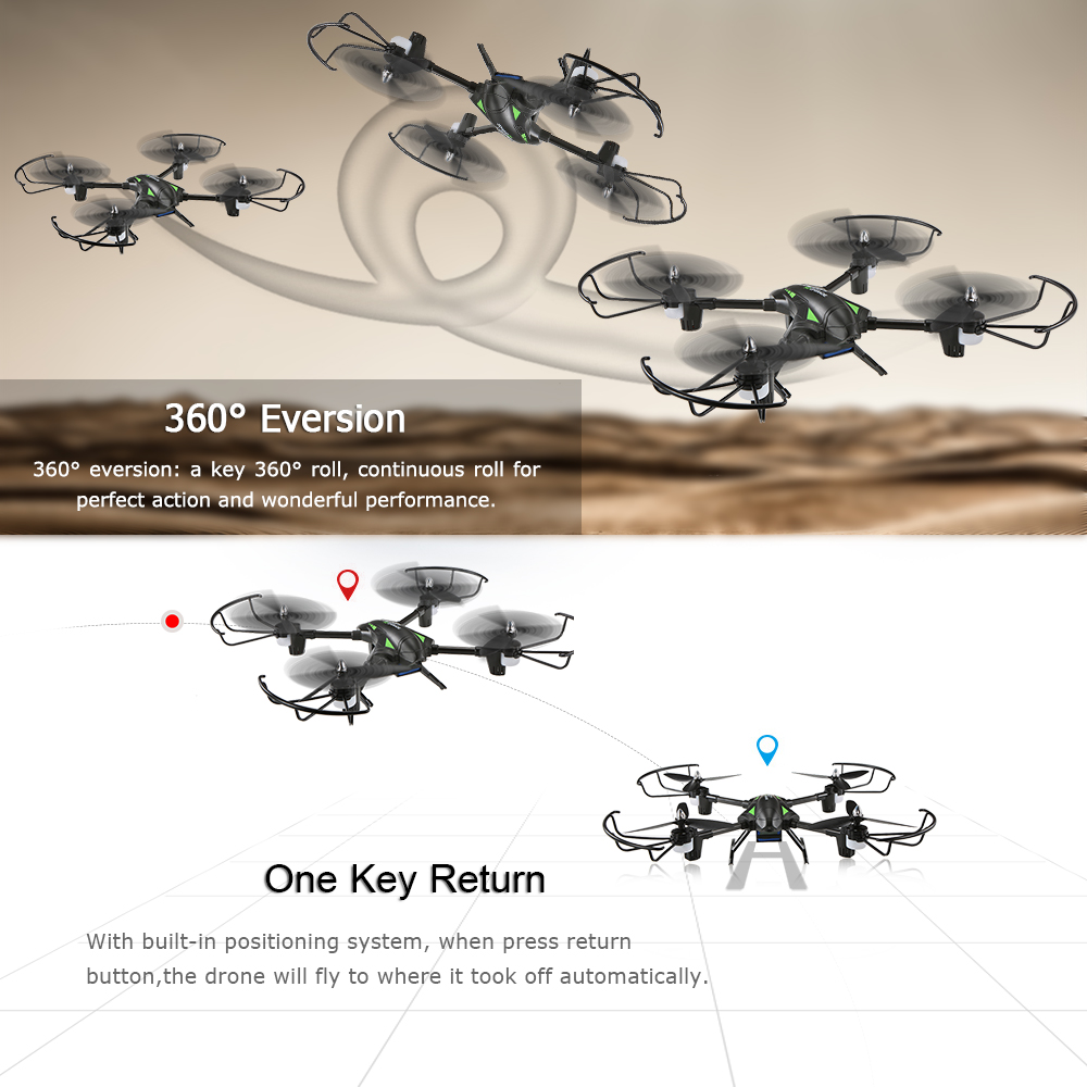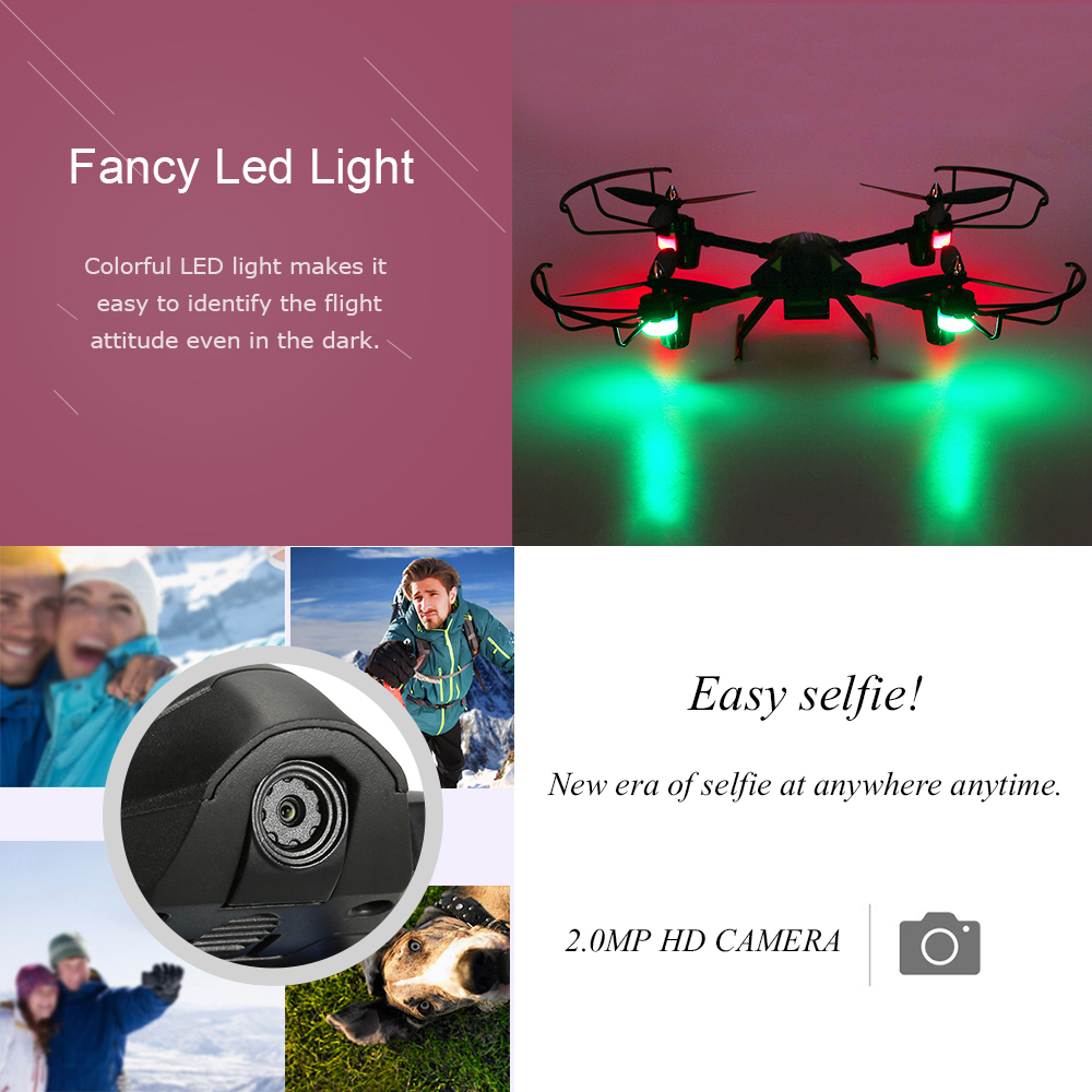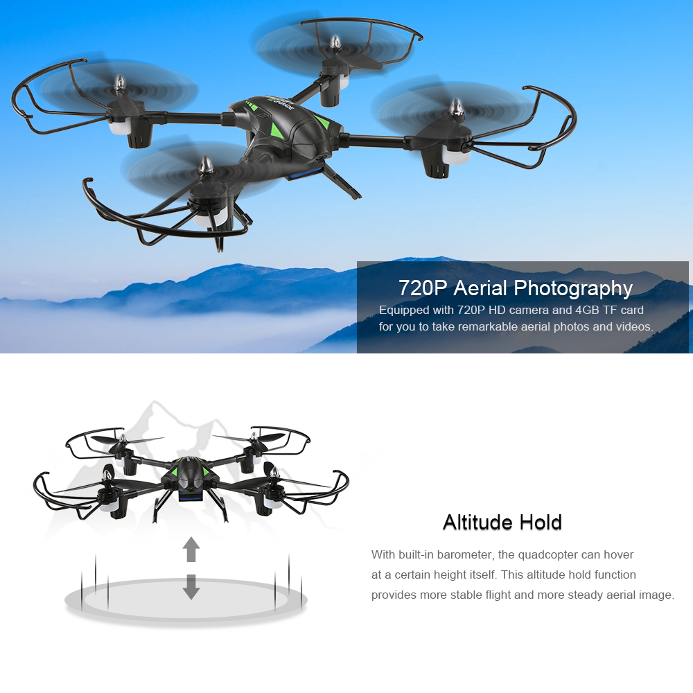 The 720P HD tiltable camera with 4GB TF card give you a great experience to overlook the world from the sky.