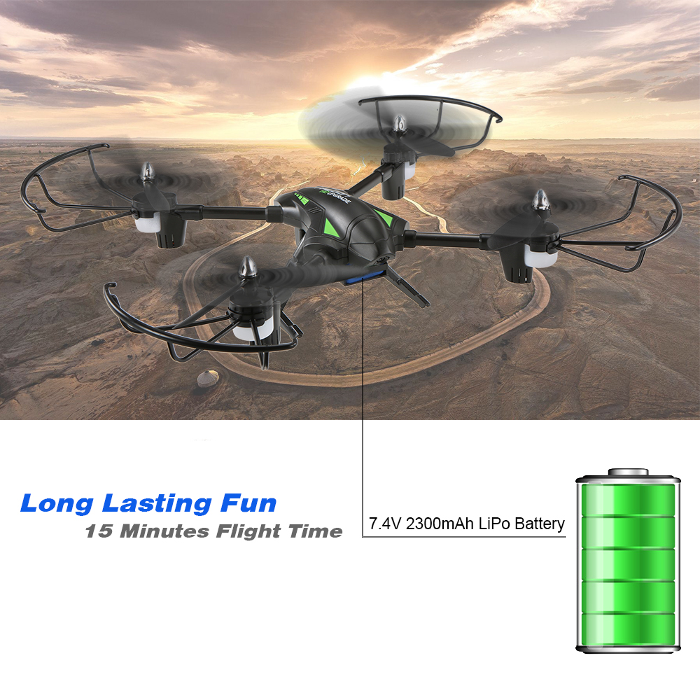 7.4V 2300mAh LiPo battery and high efficiency driving system provides about 15 minutes flying time.