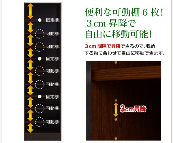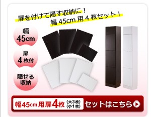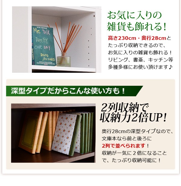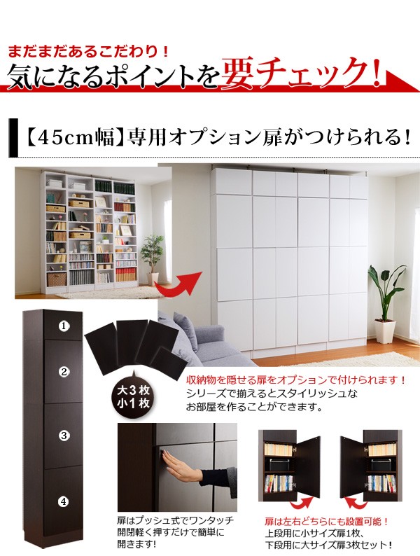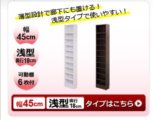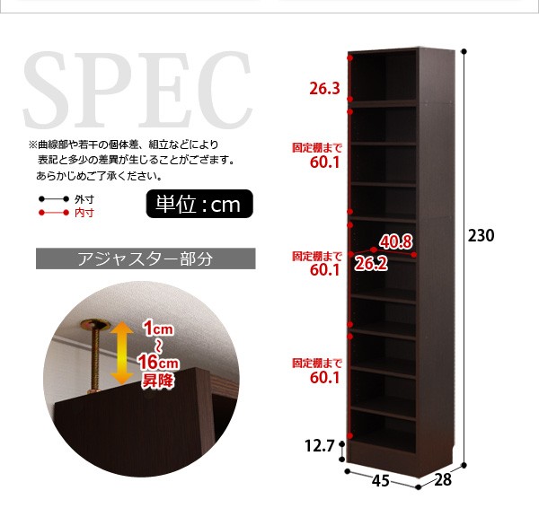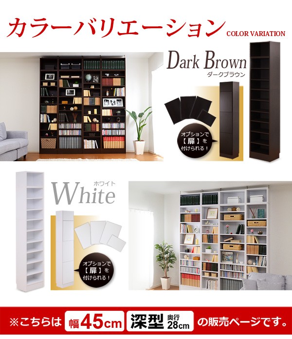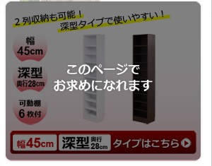 【商品について】※こちらのページは 【幅45・深型タイプ】 のページです※■サイズ:全体外寸:(約)幅45x奥行28x高さ230cm(突っ張り棒で230~246cmの天井高さに対応可能)■カラー:ホワイト ダークブラウン■素材:構造部材:パーチクルボード、MDF表面加工:プリント化粧合板、ポリエステル化粧合板、PVC※可動棚6枚付き※背面下部は幅木避け加工■その他:・生産国:中国・お客様組み立て家具です   ※メーカー直送品、商品代引き不可