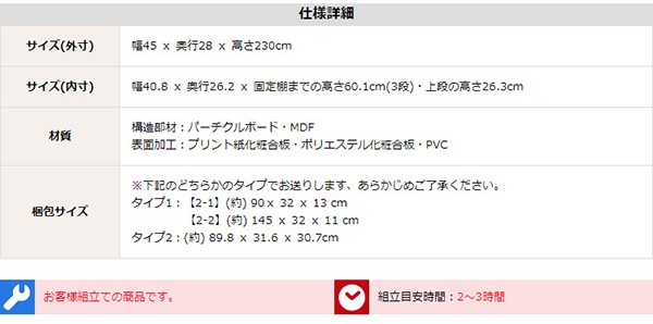 サイズ(外寸)幅45 x 奥行28 x 高さ230cm