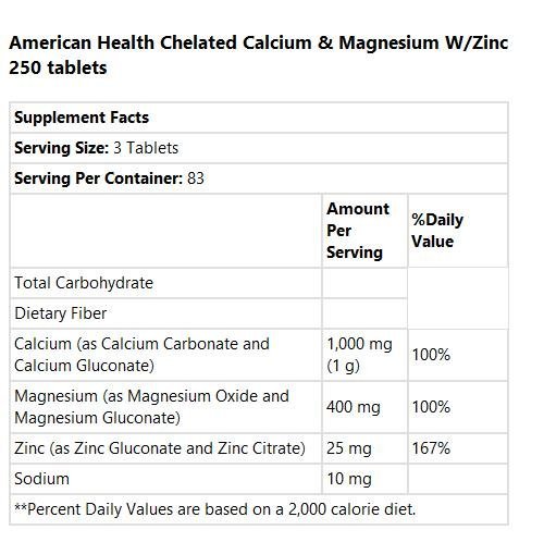 AH Chelated Calcium and Magnesium with Zinc 250 Tablets. Calcium is the primary mineral responsible for strong bones. The body also uses Calcium for proper muscle contraction and nerve function. Because the body cannot produce Calcium, a balanced diet, regular exercise, healthy lifestyle choices and adequate intake of Calcium can play a role in maintaining bone health. Calcium and Magnesium play essential roles in maintaining proper bone mineralization. Calcium and Magnesium are also involved in muscle contractions and nerve impulses. Zinc is essential for cell division and growth.Feature