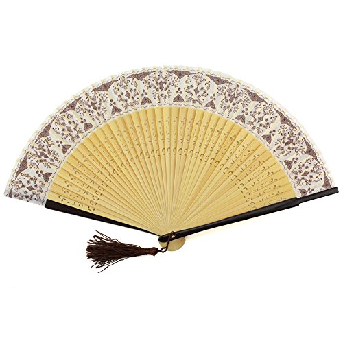 Perforated Wood Folding Fan - Ornate Print Fabric - Brown