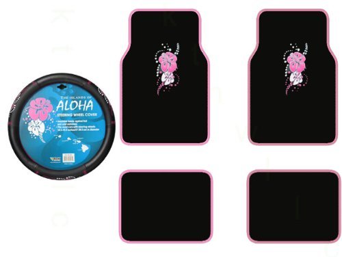 -. Title : A Set of 4 Universal Fit Hawaiian Aloha Pink Plush Carpet Floor Mats and 1 Comfort Grip Steering Wheel Cover
