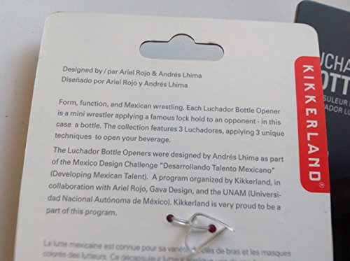 -. Brand : Kikkerland -. Color : Assorted Colors -. EAN : 0799632639312 -. Feature : Comes with 3 Luchador Bottle Openers / Bottle opener is mini wrestler applying a lock hold to your bottle / Designed by andres lhima as part of the mexico design challenge / Made of stainless steel and ABS with a rubberized coating / Each Measures approximately 2-3/4 by 6-inch -. Label : Kikkerland -. Manufacturer : Kikkerland -. Model : BO09-A -. MPN : BO09-A -. PackageQuantity : 1 -. PartNumber : BO09-A -. ProductGroup : Kitchen -. ProductTypeName : KITCHEN -. Publisher : Kikkerland -. Size : 3 Bottle Openers -. Studio : Kikkerland -. Title : Kikkerland Luchador Bottle Opener, Assorted Colors and Styles - 3 Pack - -. UPC : 799632639312