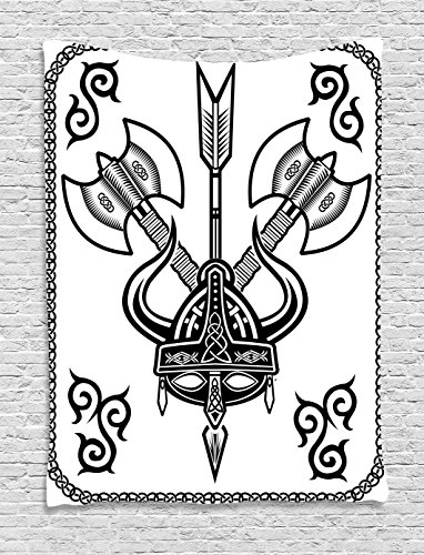 Viking Wall Hanging Tapestry by Ambesonne, Helmet with Horn Arrow Axe Antique War Celtic Style Medieval Battle Culture Art Prints, Bedroom Living Room Dorm Decor, 40WX60L Inches, Black White