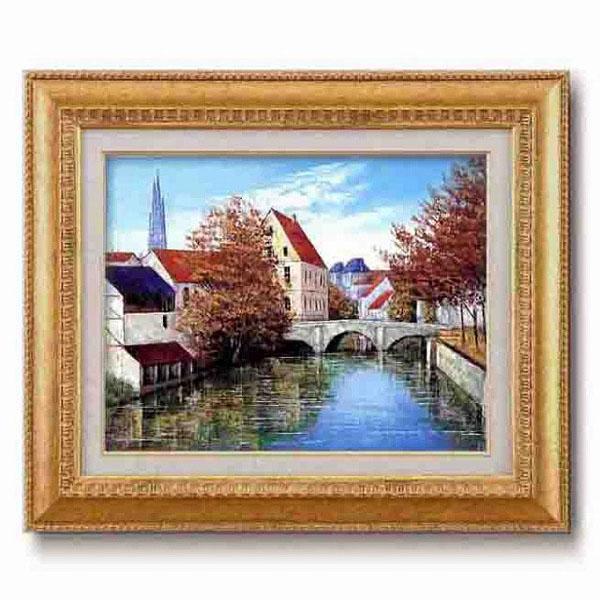 繊細な色使いで静かに流れる風景画をリアルに描いた本物の油絵額です。贅沢感ある金のフレームにセットしました。