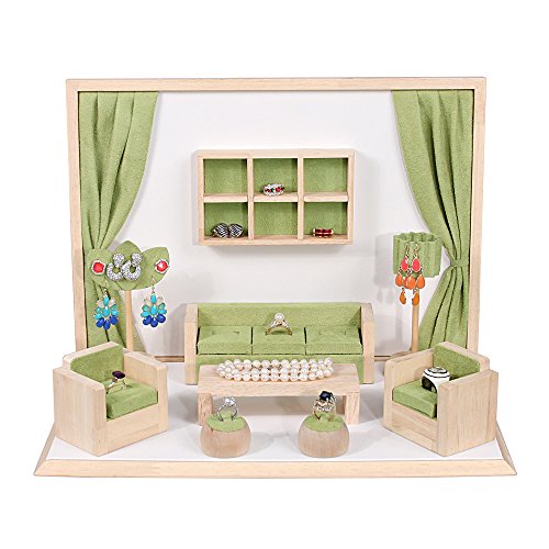 -. Feature : Features 2 miniture love seats that display a ring in each, a miniature couch that displays 3 rings, 2 stools that display a ring in each, a desk that displays your various jewelry collections, a shelf with 6 comparments that display 6 rings, 2 earring stand that holds your earrings selections / A beautiful back piece that looks like a cozy home / Made of wood and lined with green faux suede / Overall Dimensions: 16 1/2"W x 10 1/4"D x 12"H / Accessories are not included