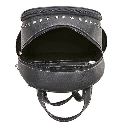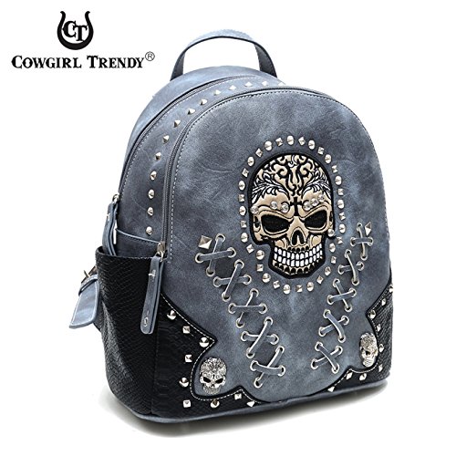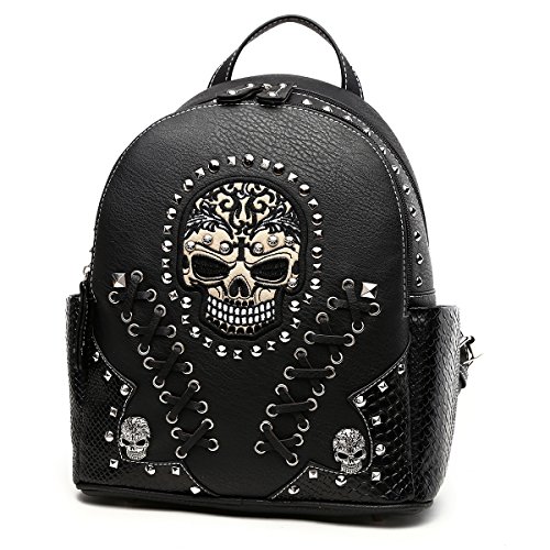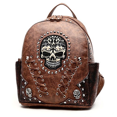 -. Brand : Cowgirl Trendy -. Department : womens -. Feature : Made from Vegan Leather - High Quality PU Leather - with a Cotton/Polyester blend lining / Proudly Designed in the United States | Silver-tone hardware / Top is zippered close to keep items safely inside / Interior: 2 zipped compartments, and 1 side zipped pocket / Backpack: Length 11.5" Height 11.5" Width 5.5" - 14" Dual Shoulder Drops -. ProductGroup : Shoes -. ProductTypeName : HANDBAG -. Title : Sugar Skull Punk Art Rivet Studded Biker Purse Women Fashion Backpack Bookbag Python Daypack Shoulder Bag