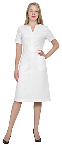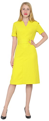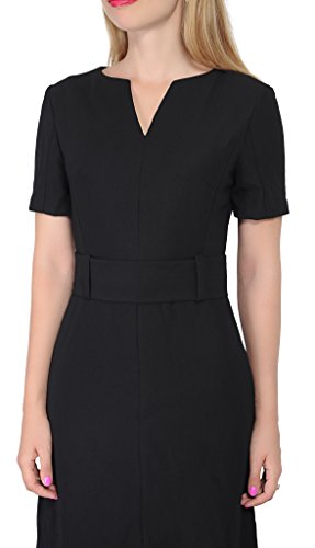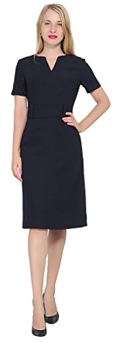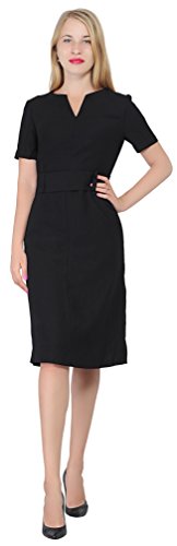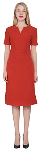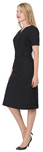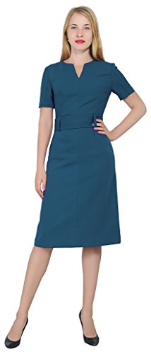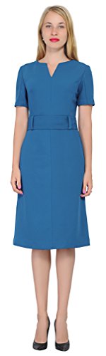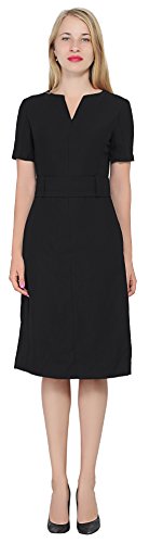 An business attire for office ladies. It is made of thick nice woven fabric, it features a slot neckline, short sleeves, a waist belt, fully lined, sheath silhouette, back copper zipper, tea length. Photos say it all.
