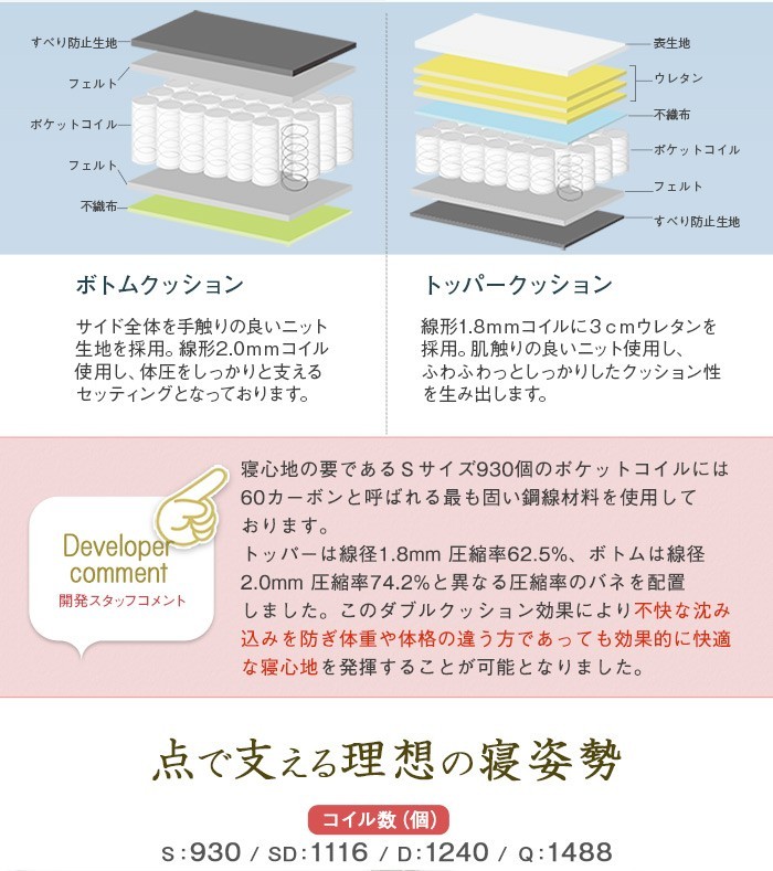 ●(トッパー)コイル数 S:465 / SD:558 / D:620 / Q:744個