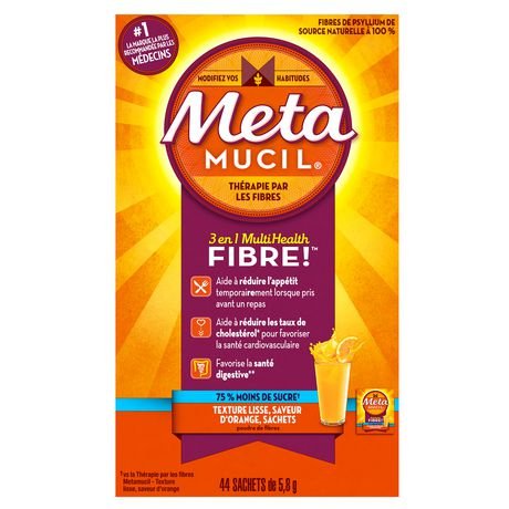-. Title : METAMUCIL 75% LESS SUGAR (NOT SUGAR-FREE) - ORANGE FIBRE SINGLES, 44 packets of 5.8 g