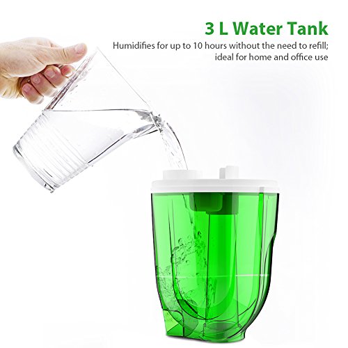 - 【Large Room Humidifier with 3-Liter Water Tank & Adjustable Mist Level】The single room humidifier safely moisturizes the air for up to 10 hours of continuous operation so you can breathe easy and get more restful sleep. High and low speed settings make it easy to adjust mist direction and speed to fit your comfort level; Provides ideal coverage for bedrooms, offices, and other medium-sized rooms.