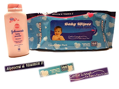 100 Count Baby Wipes Ultra Clean, Non-toxic with Aloevera, Alcohol Free, Vitamin E and Johnson's Baby Powder Blossoms 100g