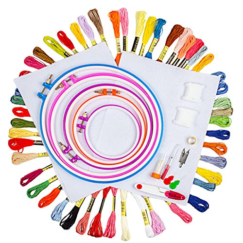 Cross Stitch Kit, 50 Color Threads and 5 Embroidery Hoops, ABUFF Full Range of Embroidery Starter Tool Kit Including Needles, Cotton Aida