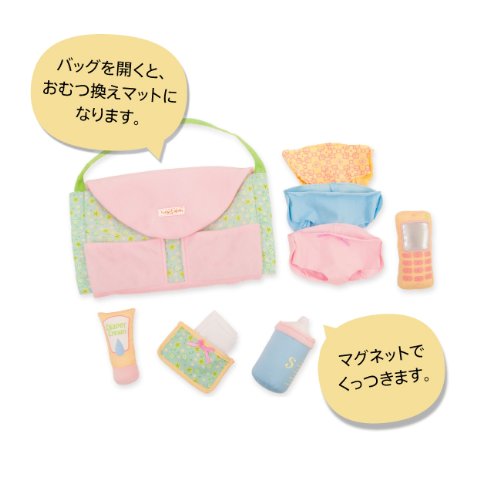 -. Feature : Part of the Award Winning Baby Stella Doll Collection, doll not included / Includes a soft, magnetic bottle, 3 cloth diapers, 3 soft wipes in wipe container, soft diaper cream and a soft cell phone / Also includes a soft, colorful diaper bag with a breakaway handle that stylishly converts into a changing mat / Equipped with two outside pockets to hold accessories / Encourages nurturing and role play