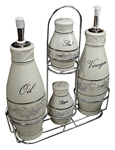 - Information: - 5 piece oil vinegar Salt pepper cruet set.- Made of durable porcelain, each set comes packaged in a satin lined display window box.- metal stand for display and storage included