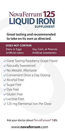 -. Binding : Health and Beauty -. Brand : NovaFerrum -. Color : red brown -. EAN : 0352304714061 -. Feature : Great Tasting High Potency Liquid Iron Supplement / Naturally Sweetened raspberry grape flavor / FREE of sugar, alcohol, dye, lactose, soy & gluten. / 36 servings (5-week supply) / Convenient once a day dosing - KOSHER -. Label : Gensavis Pharmaceuticals, LLC -. LegalDisclaimer : Statements on this page have not been evaluated by the Food and Drug Administration. This product is not intended to diagnose, treat, cure or prevent any disease. -. Manufacturer : Gensavis Pharmaceuticals, LLC -. ProductGroup : Health and Beauty -. ProductTypeName : HEALTH_PERSONAL_CARE -. Publisher : Gensavis Pharmaceuticals, LLC -. Studio : Gensavis Pharmaceuticals, LLC -. Title : NovaFerrum 125 Liquid Iron Supplement -. UPC : 352304714061