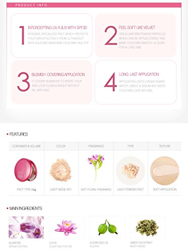 -. Feature : This tint of natural looking colour combined with sun protection blends smoothly over skin, and moisturizes while providing light-weight, comfortable, full coverage. / Prevents UV A and UV B at same time with UV Protection (SPF30/PA++) : Protect the clean and healthy skin from UV rays with miniatured balanced ingredients. / Miniatured particle provides adhere closely to the skin : Made with miniatured particle that absorbs smoothly into the skin to give the transparent and luxurious look while maintaining a light and fresh feel to give clean and bright makeup finish. / It's tough on sebum and sweat to keep the skin fresh without being oily : Presents fresh skin without being oily from sebum nor sweat. / Keeps clean and bright skin tone 24 hours without apply double time : Prevents erasing make up by sweat or sebum with fluorine compound coated powder.