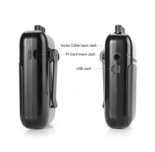Feature : 1. 5W output guitar amp,with built-in distortion effect device. / 2. Capable of reading TF card(up to 32G), play any format of music. / 3. There sockets for connecting headphone, microphone and aux. / 4. Recording function,recording file can be saved in TF card.(TF card not included) / 5. Belt clip strap,easy to carry around